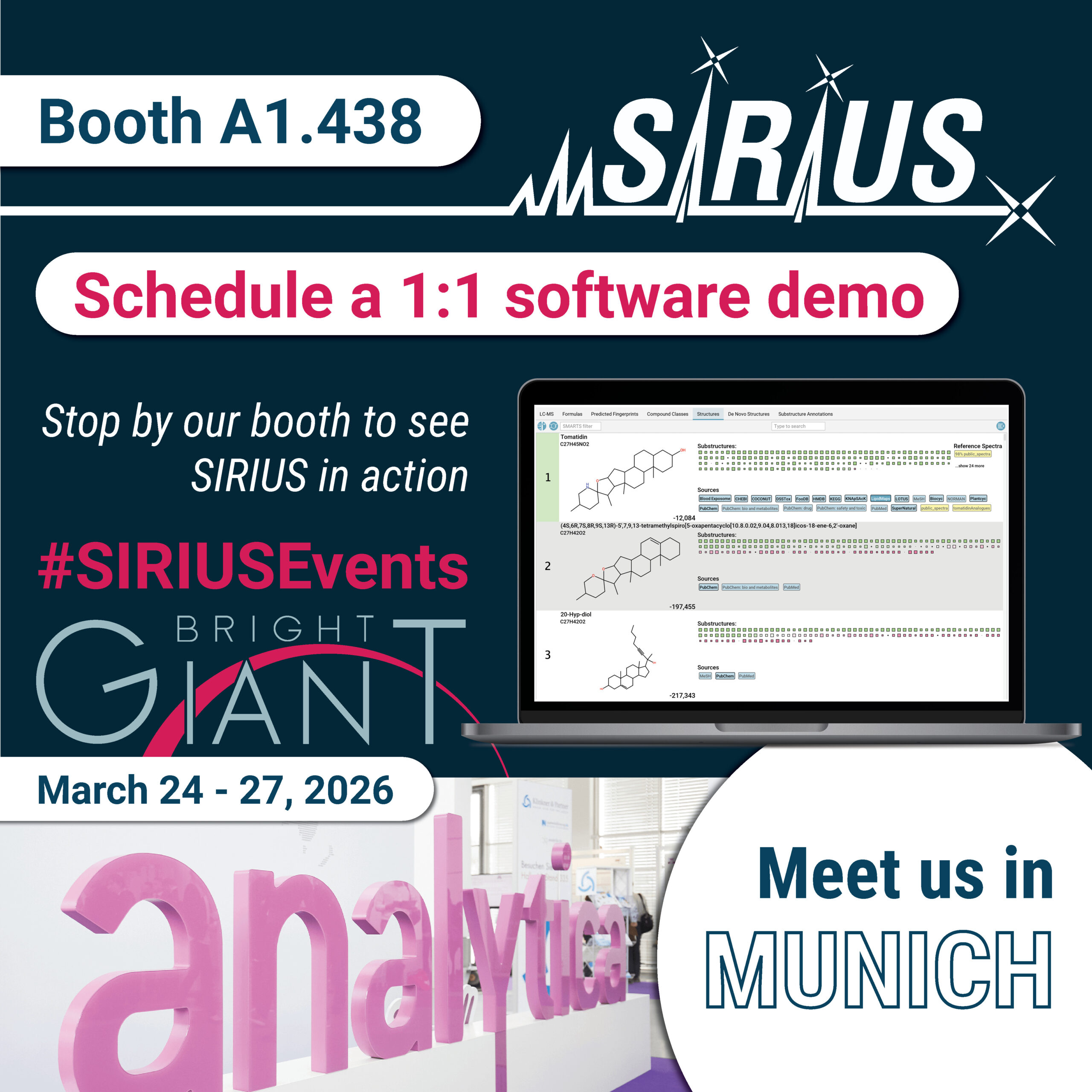 The largest gathering for laboratory technology and analysis is just days away, and we are geeting ready to meeting you in Munich! See SIRIUS 6 in action—from automated LC-MS/MS preprocessing to de novo structure generation of unknowns.